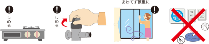 引火する恐れがあるので、換気扇や電灯等のスイッチには絶対に手を触れないでください。